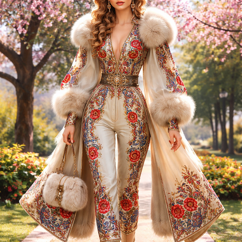 A Female Jumpsuit design, suitable for Spring. Consider Russian fashion — fur and layering traditions, bold patterns, mi...