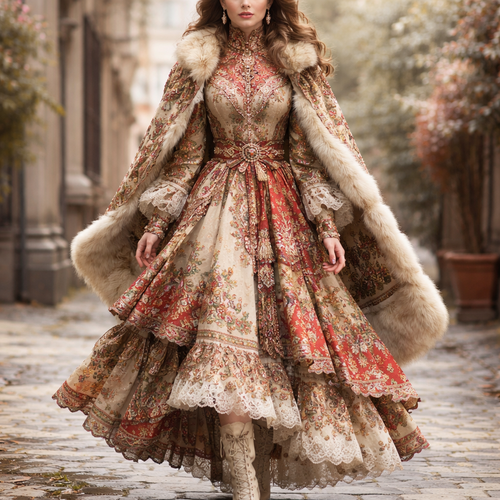 A Female Dress design, suitable for Spring. Consider Russian fashion — fur and layering traditions, bold patterns, mix o...