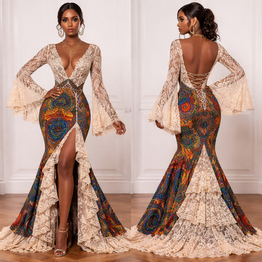 I to create an evening dinner dress that unique and elegant that is made from African lace fabric and mixed with beautiful ankara fabric., boho_chic style, show front and back