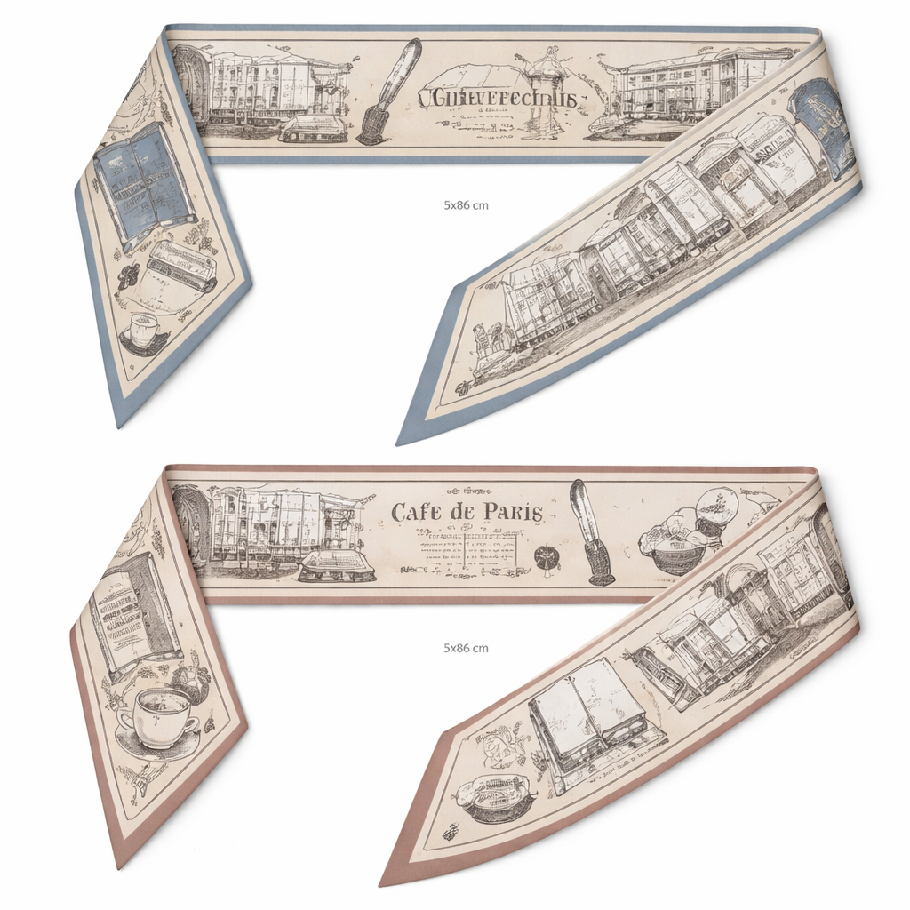 Design a silk scarf thanks 5x 86cm to be wrapped on the handle of a purse. Lean into French intellectual heritage—not universities. Inspiration • Left Bank cafés • Vintage Paris library card graphics (reimagined) • Hand-drawn quill lines • Architectural line art (generic, not Notre Dame, Sorbonne, etc.) Color ideas • Soft black + parchment • Dusty blue + ivory • Blush + espresso brown