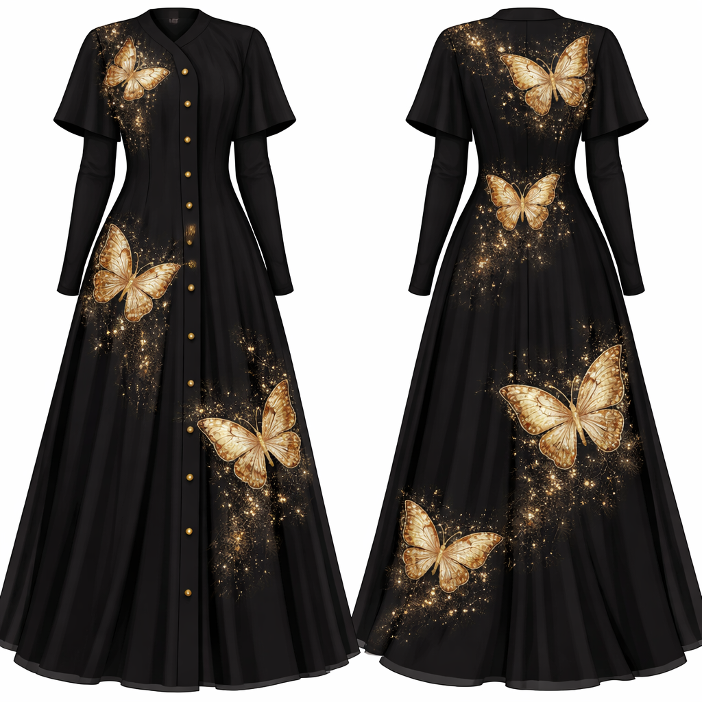 don’t draw the face and the drawing should not be human but fashion design so the texture and look should be of that of an Abaya for Muslim girls black in color make sure it’s short sleeved paired with a black long sleeve shirt in the inside and make it have golden buttons from the middle till down it’s long as well and make it have big gold butterfly patterns on it with shiny gold on it as well, show front and back