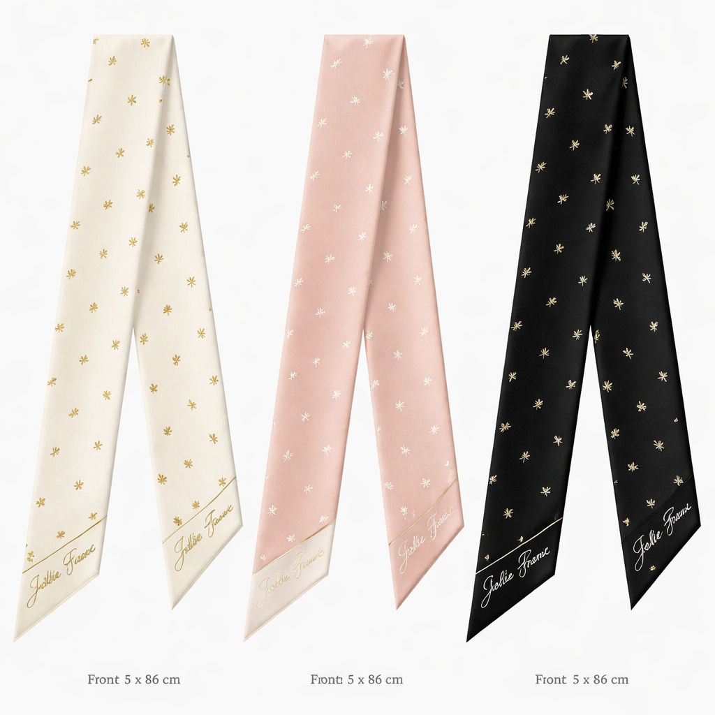 Design a silk scarf that is 5 x 86 cm with oblique edges. Design: Tiny laurel leaves spaced evenly (not dense) • Scale: Each motif no larger than 6–8 mm • Symbolism: Achievement, success, honor Works especially well in: • Gold on ivory • Pearl on blush • White on black Add Jolie Franc at oblique edge