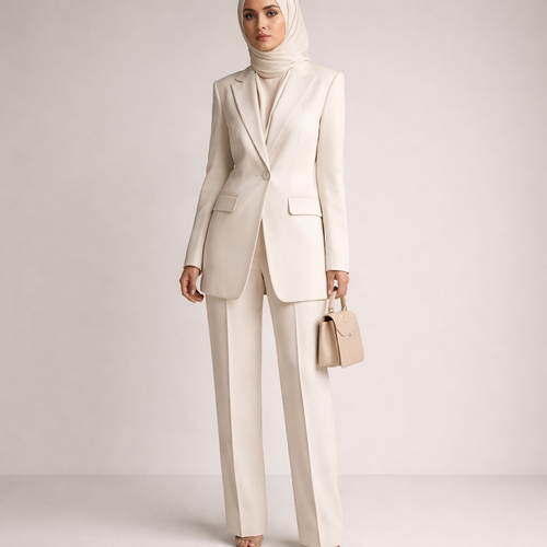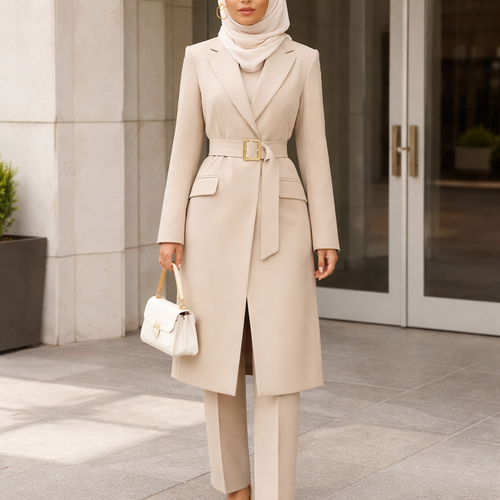 Blazer ceintré extra long avec pantalons droit , femme voilée