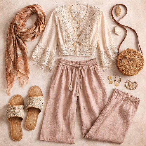 Few ideas…Create flat-lay outfit mockups boho chic (top + pants + shoes + scarves + jewelry together) make look expensiv...