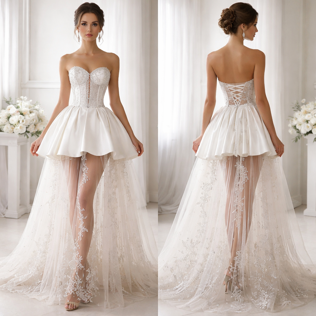Short corset flare strapless gown with sheer illusion inner gown , show front and back