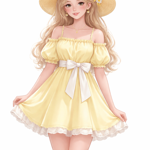 Cute simple pastel yellow short dress with sleeves on the arms and a nice hat white a yellow sash with daisy’s on it and...