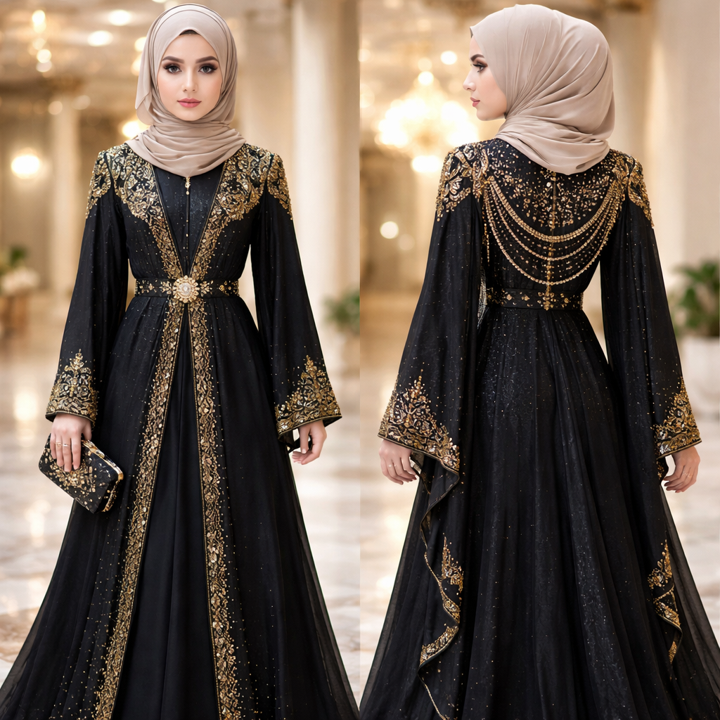 A neat formal aesthetic abaya teen and pretty with hijab in black and gold theme , glamorous style, show front and back