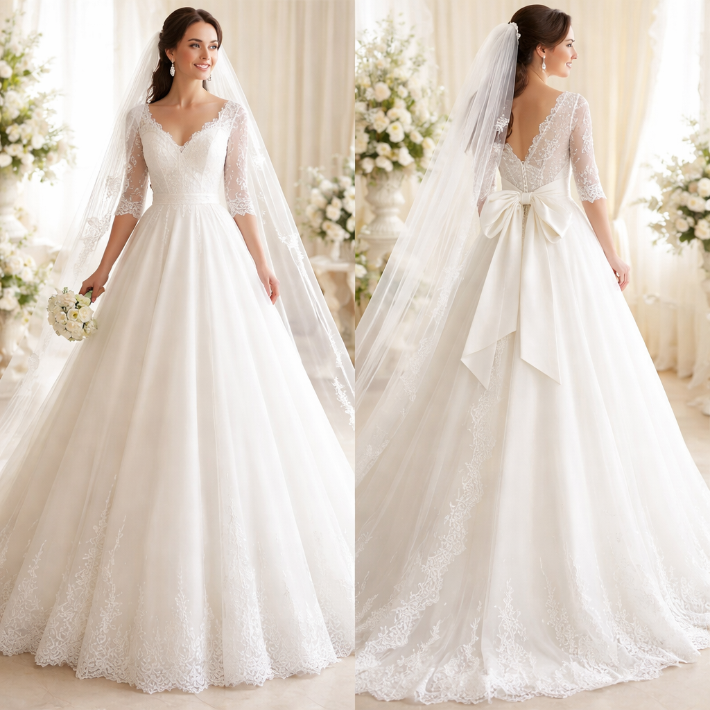 Create a brilliant white wedding dress with v neckline showing no cleavage, lined with elegant feminine frills, and 3 quarter sleeves in lace, add a large bow at the back of the cinched waistline, and with a line shape of the dress and a wedding veil that is the same length as the dress, glamorous style, show front and back