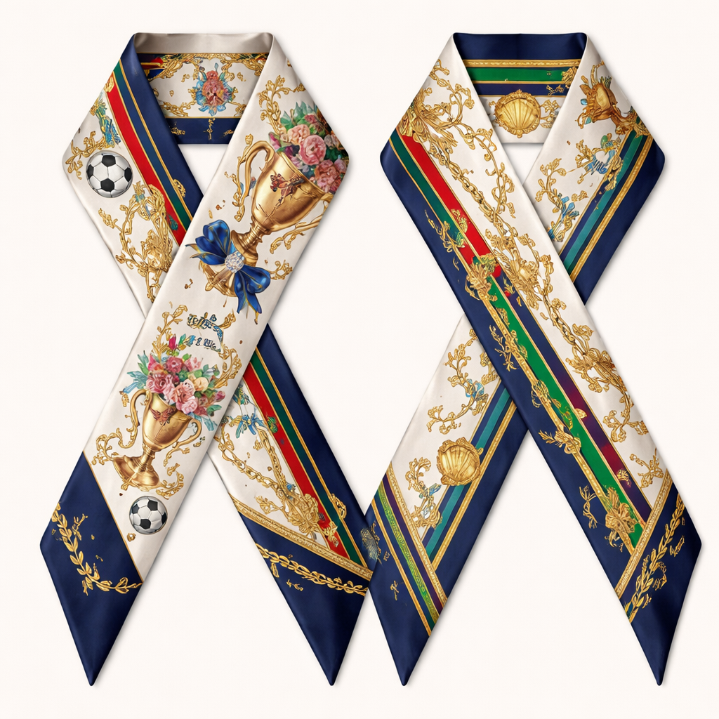 Design a scarf that is 5x86cm to be wrapped around the handle of a handbag for the World Cup 2026 no logos or words. Something Blair Waldorf would wear , classic style, show front and back