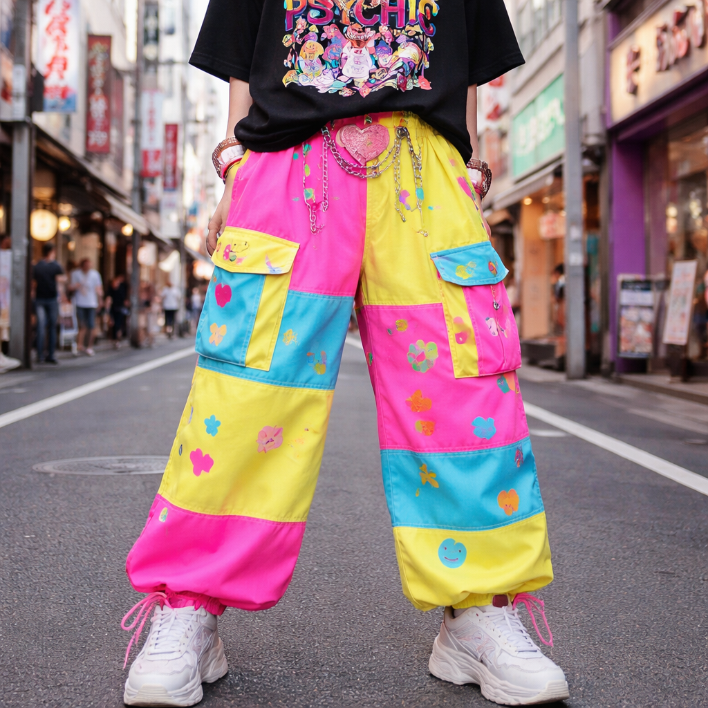 Japanese Street fashion design: Neon pink, yellow, and blue cotton cargo pants with playful pattern blocks. Wide leg, relaxed fit, drawstring ankles. Layered chains and bold graphic tee.