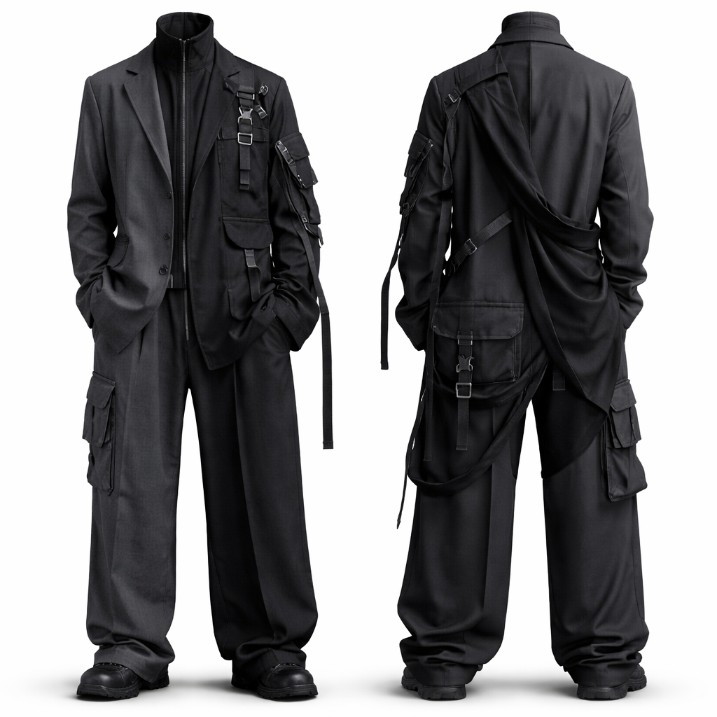 I want a cyberpunk unisex outfit that is split in the middle of the body from the neck down to the pants. The whole outfit should look like two different styles joined together. One side should look structured and clean, and the other side should look loose and draped. The left side should have a more tailored look — like a fitted jacket sleeve and a straight pant leg. The right side should look more experimental — looser fabric, maybe a wider pant leg or draped fabric panels. The outfit should be one full piece visually, but designed with a vertical seam exactly in the center of the body dividing the two styles. Use two slightly different fabrics or textures so the split is noticeable. The silhouette should be oversized so it fits any gender, with relaxed shoulders and comfortable movement. I also want cyberpunk details like straps, metal rings, or utility pockets on one side to make it look futuristic and rebellious.
