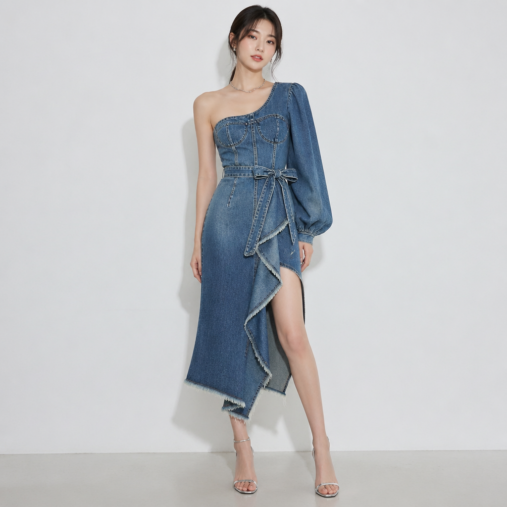 photorealistic fashion design, A Female Dress design, made of Denim, for Party, suitable for Spring, in Korean Fashion style, korean_fashion style, just the design no text