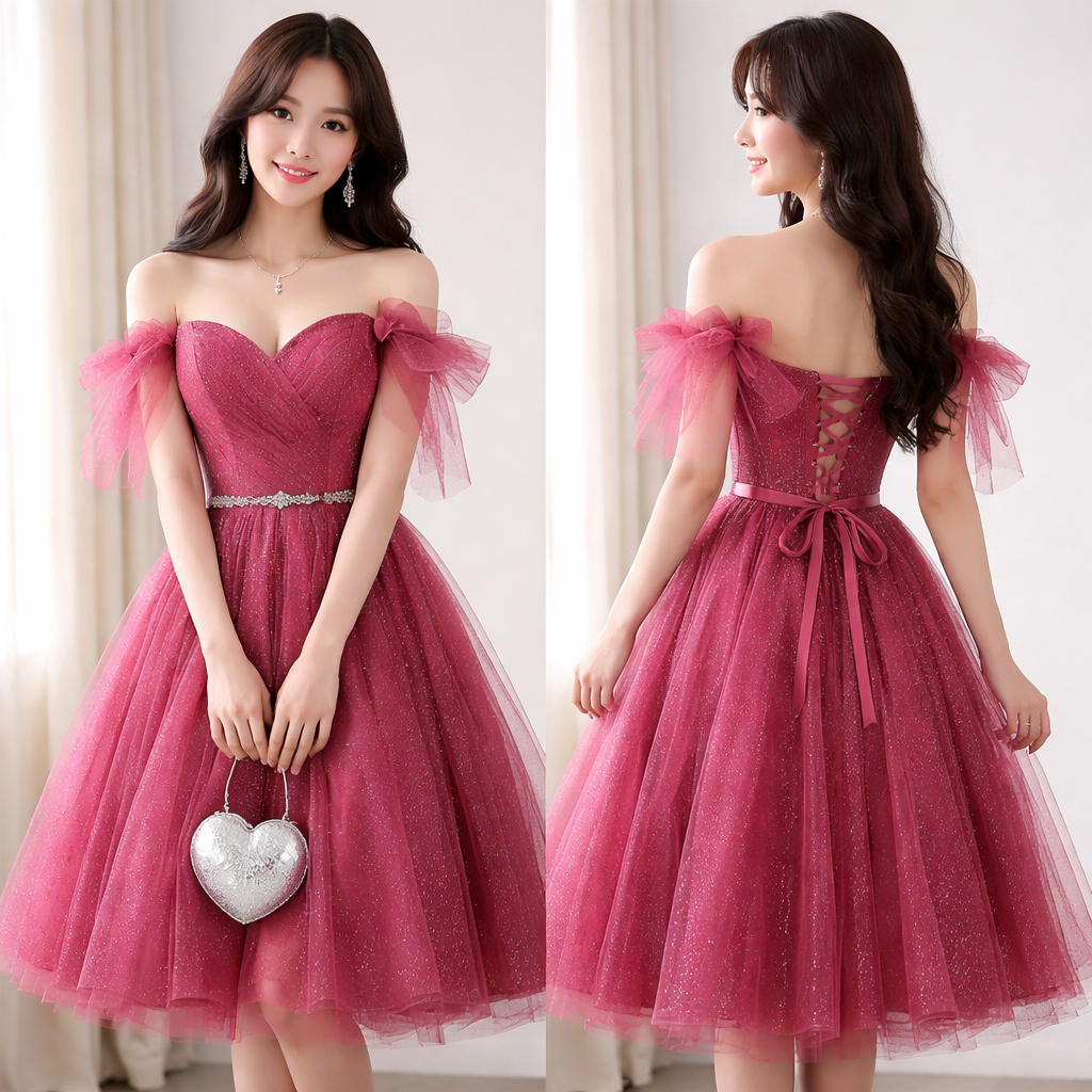 Prom dress and color combo for the girls dark pink , korean_fashion style, show front and back