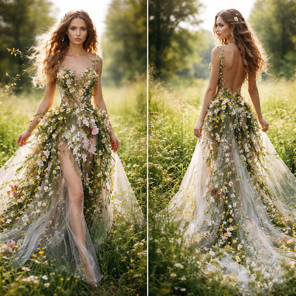 Make me a High Fashion ready for Magazine Print of a Biophilic Dress Design that looks like the fliers and greenery are alive —make the model in a field of greenery and flowers , show front and back