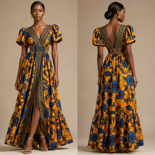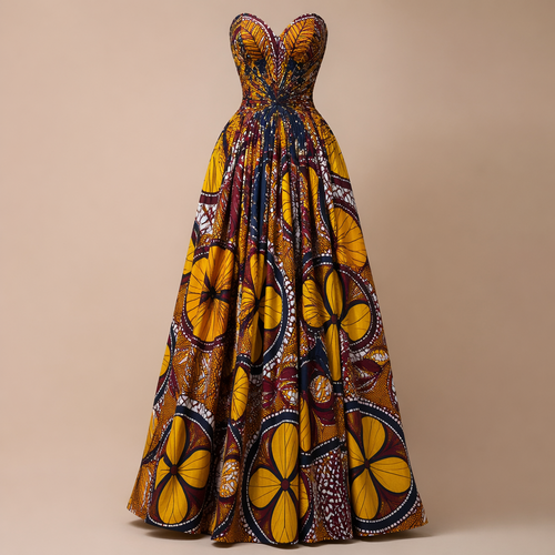 A Female Dress design, suitable for Spring, in African style. GM fashion aesthetics.