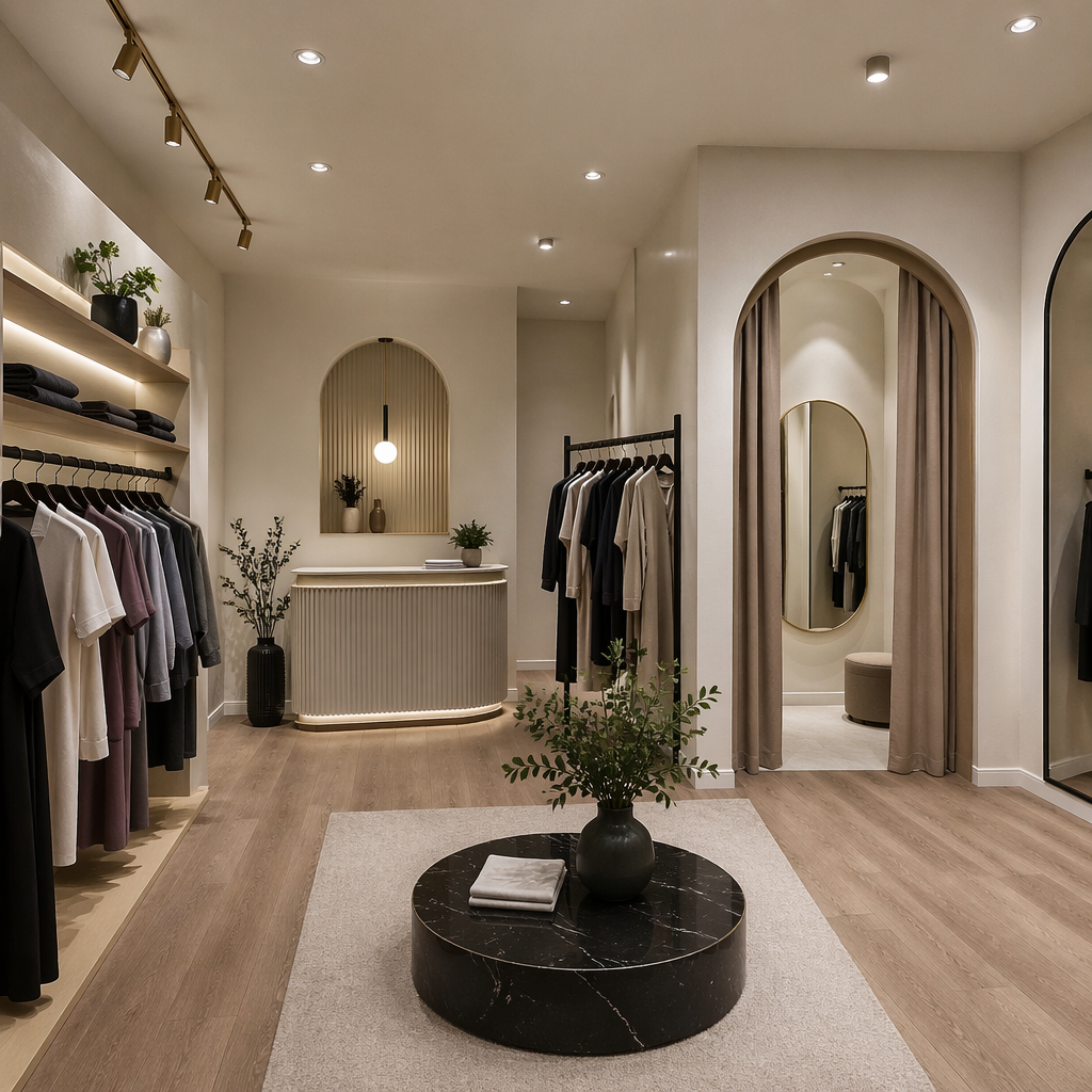photorealistic fashion design, Add fitting room Shop is 470sqft, just the design no text