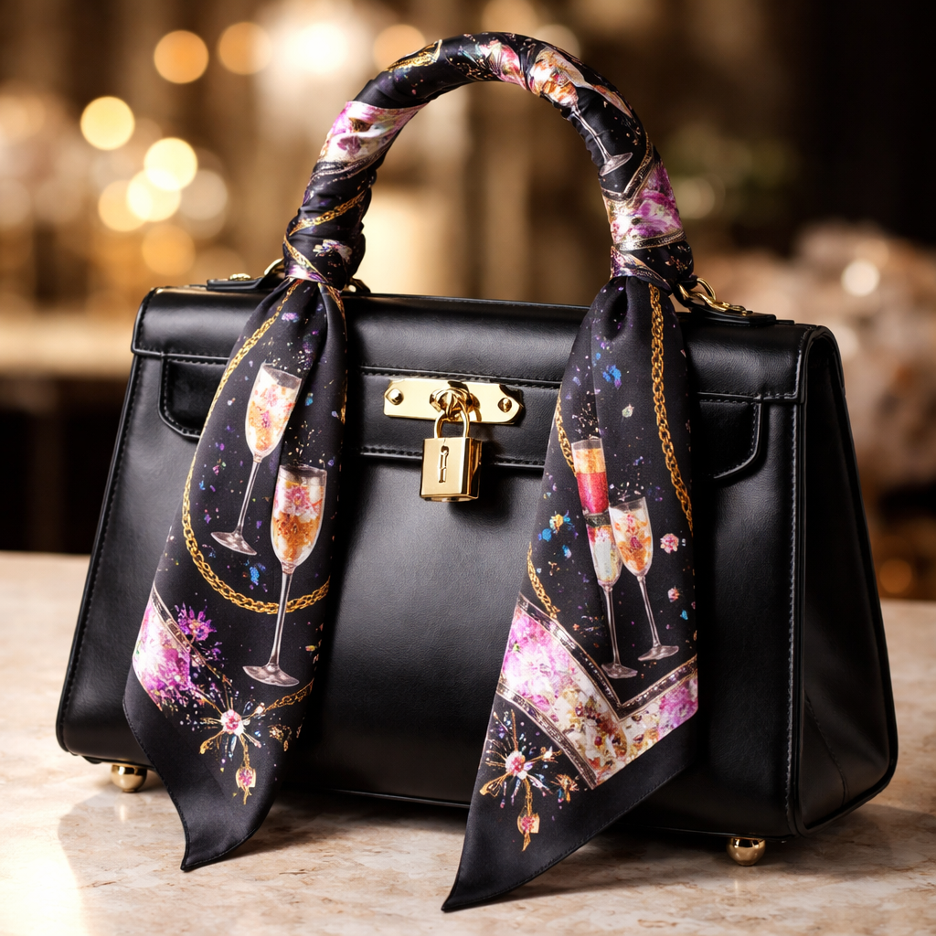 Silk scarf that is 5x86cm designed for a handle on a Kelly style bag for a woman going out to a nightclub