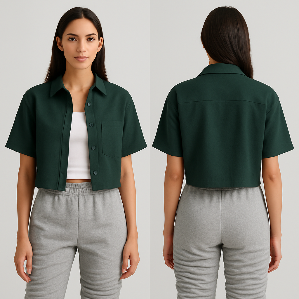 Short fitting Dark green Open boxy button up with wifebeater as undershirt and grey super super stacked sweats on woman. With hint of a sporty look in the button up, business style, show front and back