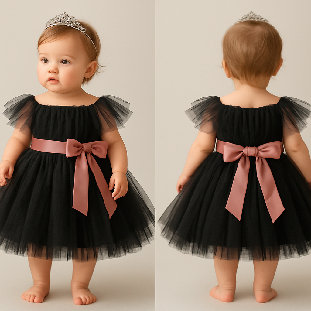 1歳の女の子のベビードレス着用画 黒のチュールドレス、膝丈のラッフルスカート(ボリューミー) 上半身は、細かいギャザーを寄せたチュールのボディス 胸元から肩にかけてふんわりとかかるオフショルダー風のチュールを重ねたデザイン 肩まわりは、柔らかいチュールを何枚か重ねて、肩にふんわりとかかる“オフショルダー風”のデザイン チュールは腕を覆いすぎず、胸元の中心に軽くねじって寄せたような立体感が出る仕上げ肩から肘上までリボンのような形のチュールを被ってるような感じ、 胸下の切り返しにローズピンクのサテン生地の太めのリボンを一周巻いて、真ん中ではなく、左前あたりで大きくリボン縛り 後ろにリボン縛りはなし 頭には派手すぎないシルバーのティアラ, show front and back