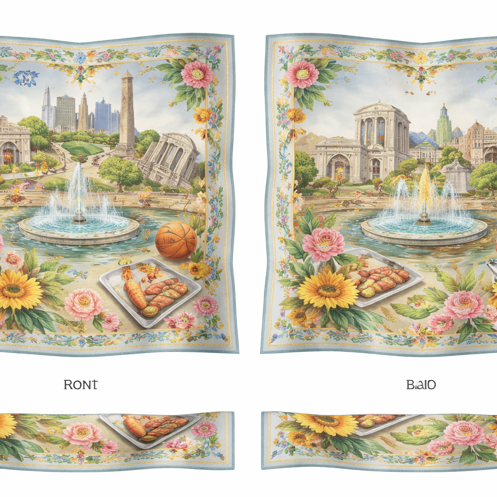 Design a silk scarf that is Kansas City lifestyle. No logos or words jus simple and elegant , classic style, show front and back
