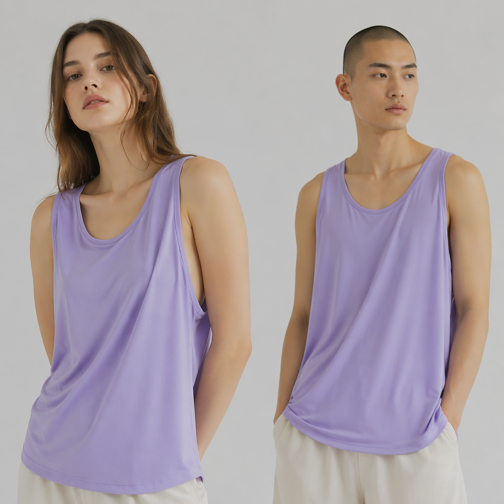 A Unisex Dress design, suitable for Spring, in Casual style. Loose tanktop for the summer. Pastell purple, good quality. Absorbs sweat easily. Seamless, ultra soft and no irritation. No tags.. Sweden fashion aesthetics.