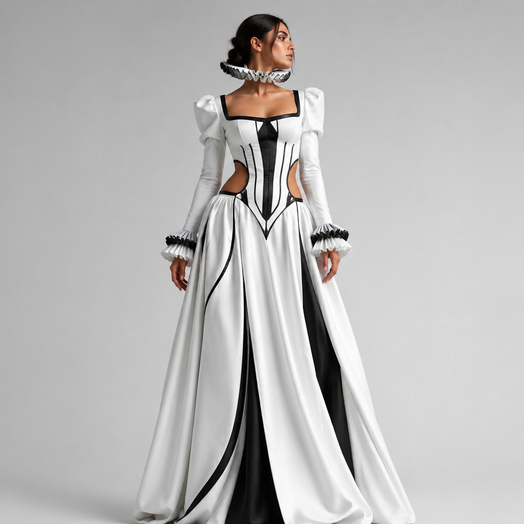 A Female Dress design, suitable for Summer. quiero un vestido blanco y negro de la época colonial, moderno y con un toque futurista. VE fashion aesthetics.