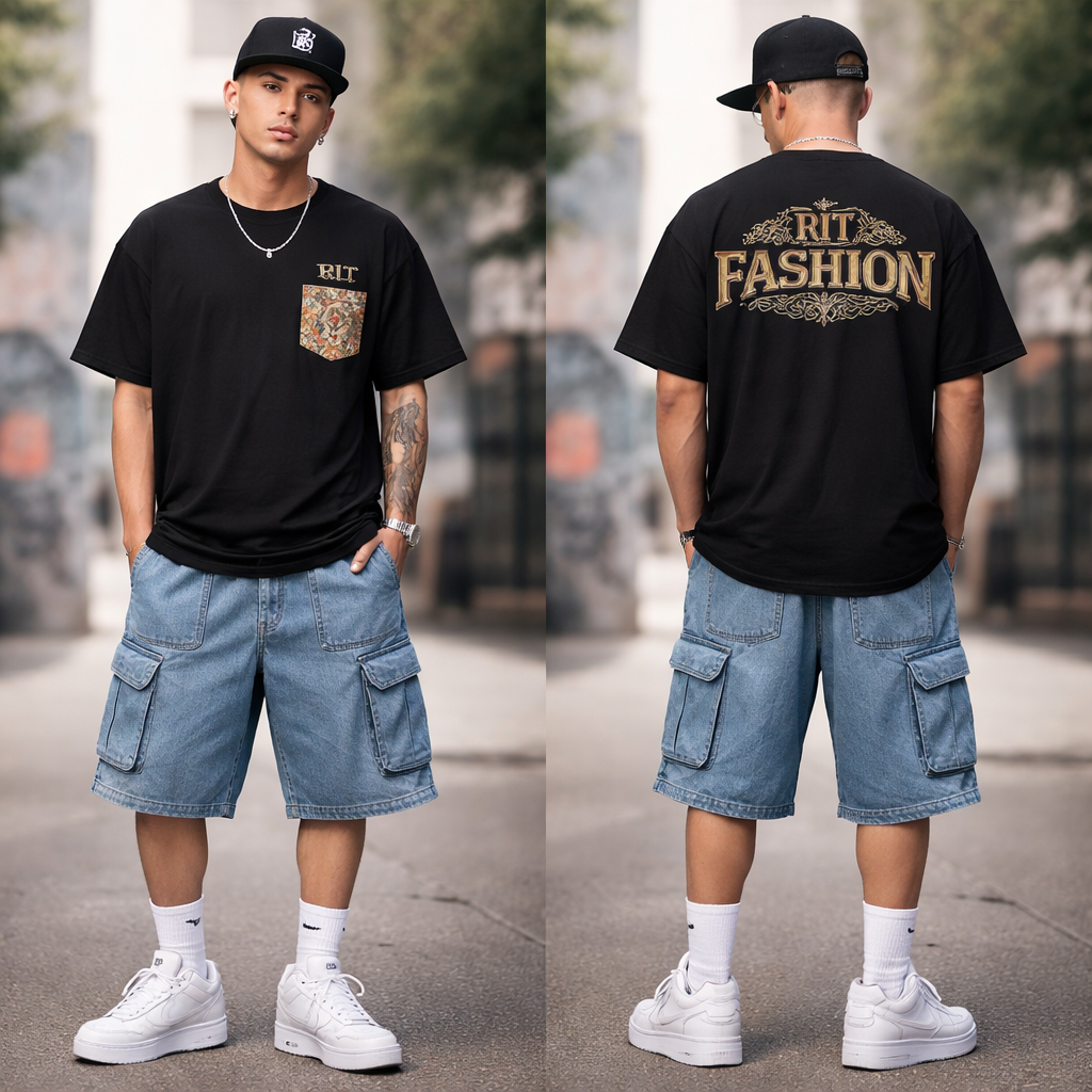 Black T-shirt with RIT Fashion embroider with A vintage print breast pocket paired with a a denim cargo shorts white socks and white air force one sneakers with a black SnapBack cap , streetwear style, show front and back