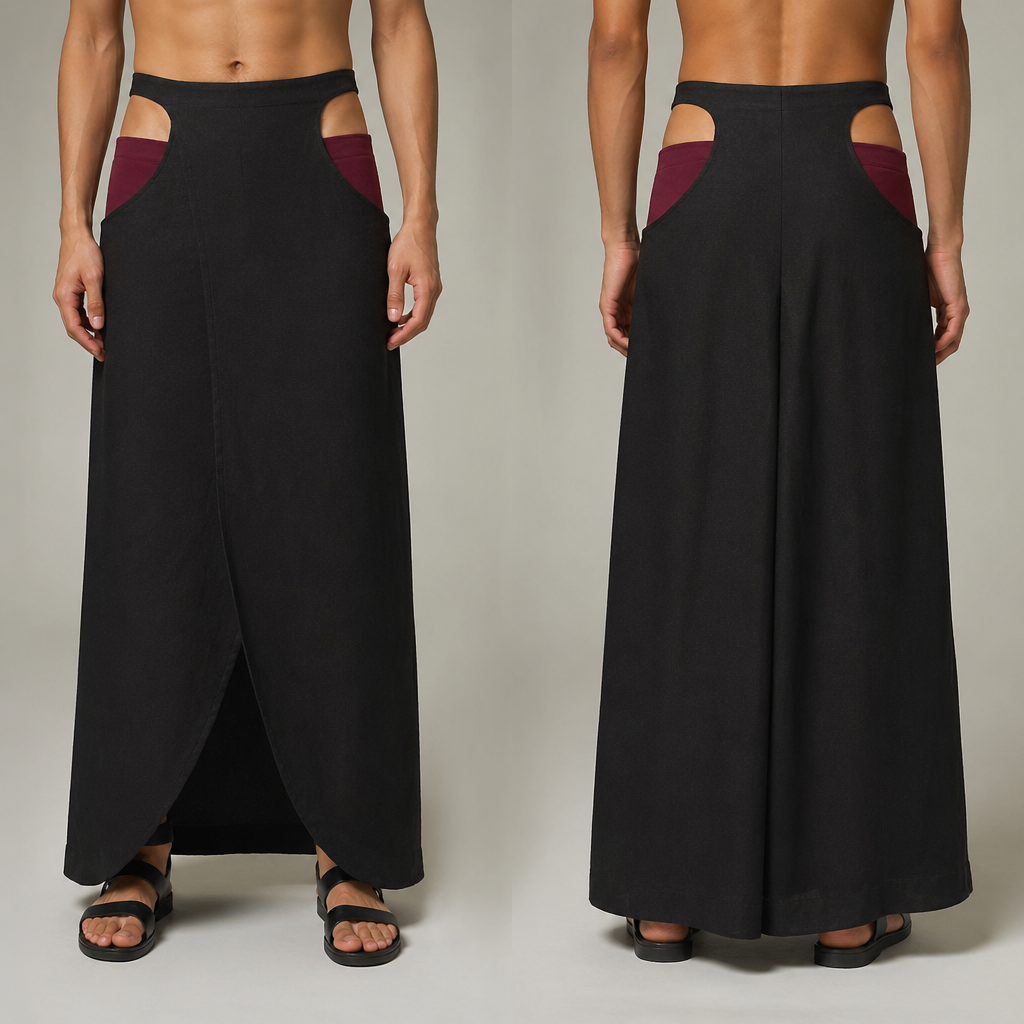 photorealistic fashion design, A Male Skirt design, suitable for Spring. can you make the skirt on this a full length and the cutout above shape make the skirt black linen and the shorte dark red canvas. Design with modest coverage., just the design no text, show front and back