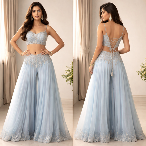 A light blue dress that has a crop top with sheer fabric on the sides, so you can see the stomach, with a flared palazzo...