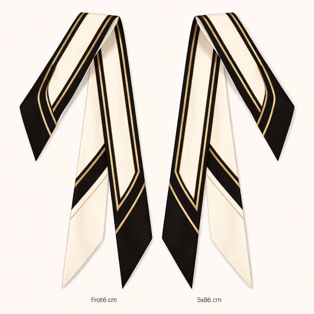 Design a silk twilly that is 5x 86 cm to be wrapped around the handle of a purse Make it iconic. Very Simple and tailored. No chains. Elegant and sophisticated , classic style, show front and back