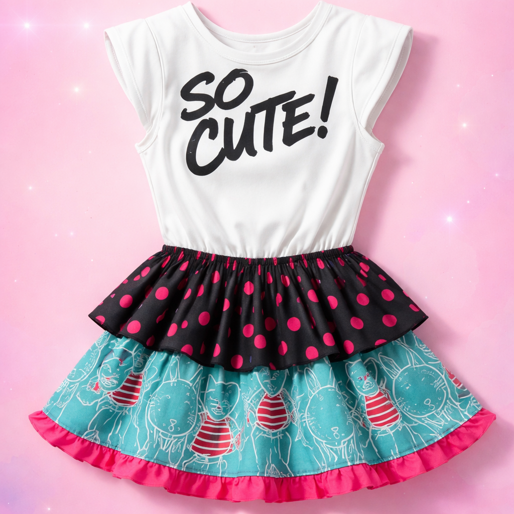 Eighties fashion design: Cute white cotton feminine tank top with a high neckline, black graffiti lettering, and exaggerated shoulder pads. Two gathered layers below the waist: black with hot pink polka dots, and aqua cat line drawings with red stripes.