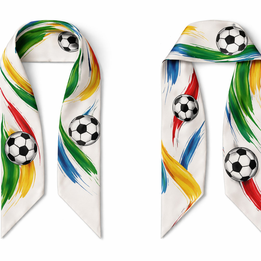 Design a silk scarf that is 5x 86cm with oblique edges. Make it an abstract soccer theme. Super simple, classic style, show front and back