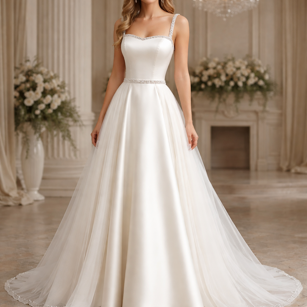 Wedding style dress. Size 14 UK. Corset bodice, white, silk, studded with diamonds in a line along the top. Wide thick sleeveless straps. Box shaped neckline. A-line skirt, floor length, silk. One gauze layer going around three quarters of the silk skirt, leaving it open at the front, the same length as the silk skirt. A line of diamonds studded along the hem of only the gauze skirt. A thin ribbon around the waist, no bows, studded with a line of diamonds.