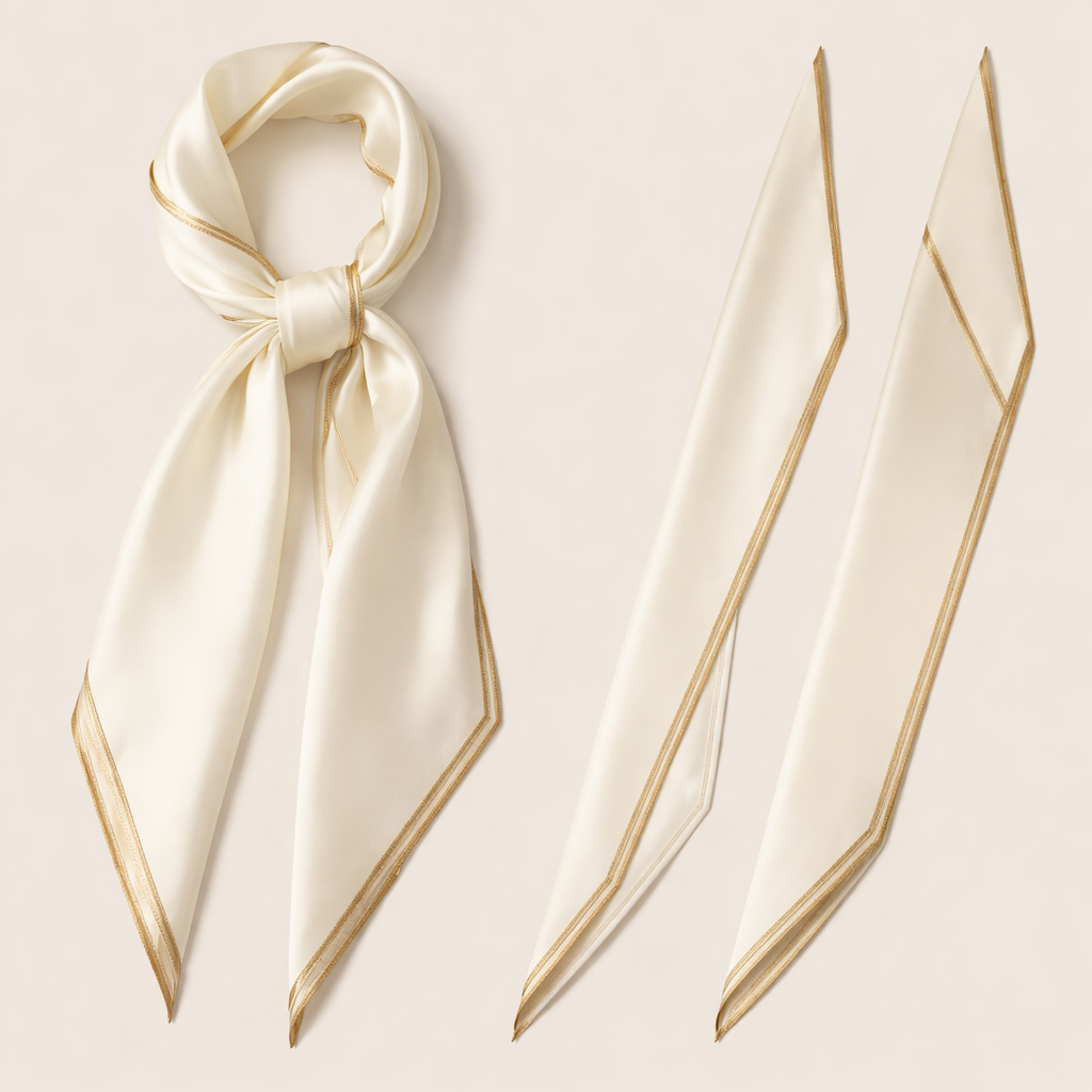 Design a silk scarf that is 5 x 86 cm with oblique edges. Design: Solid silk body • Edges: Narrow diagonal contrast band following the oblique cut Example: Cream silk + thin metallic gold edge , classic style, show front and back