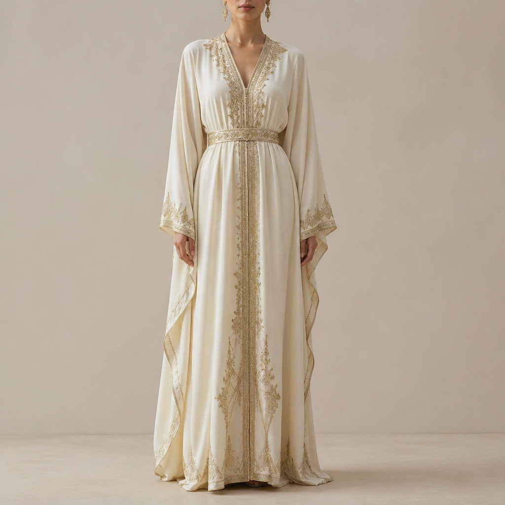 A Female Dress design, suitable for Spring, in Classic style. Algeria fashion aesthetics.