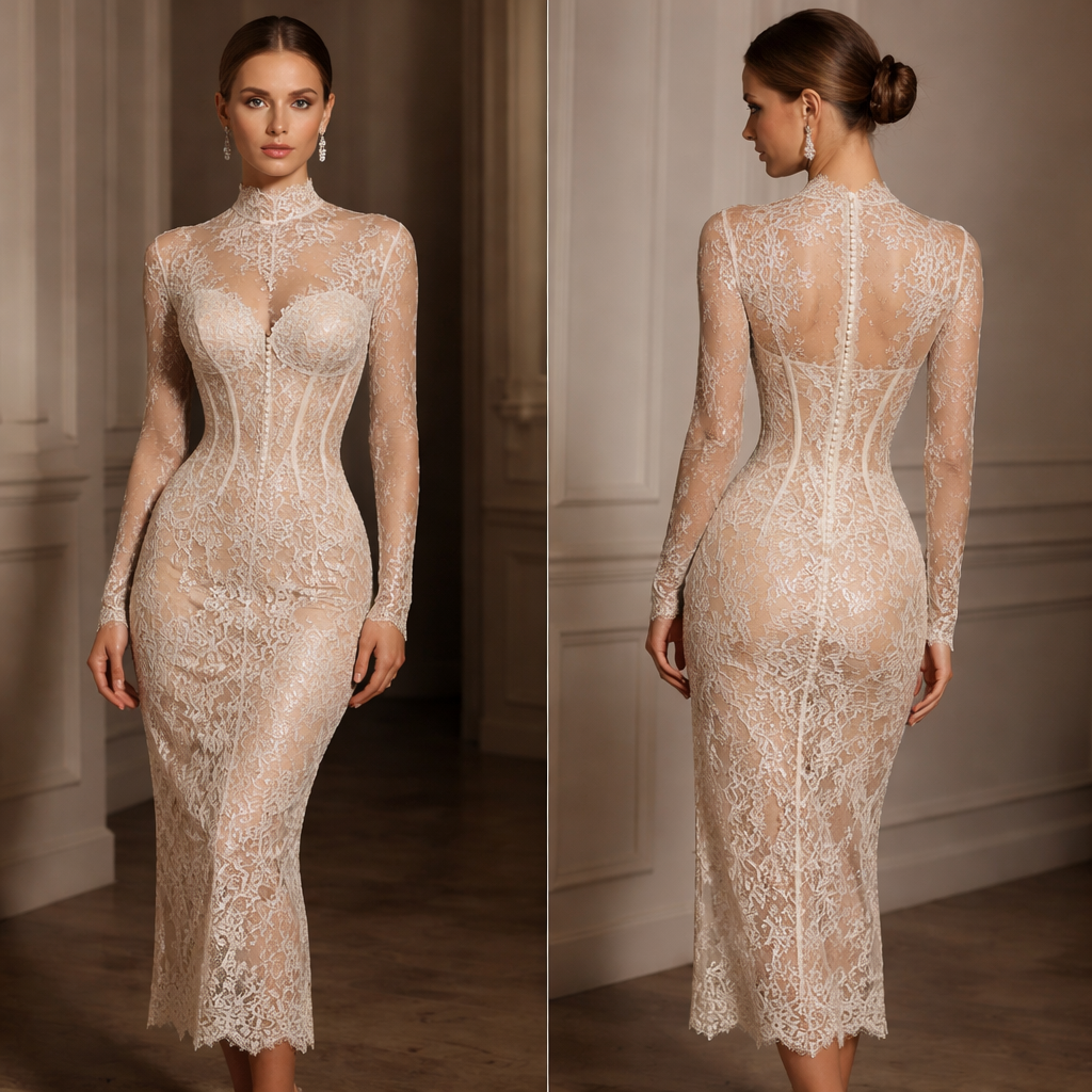 Luxury evening lace dress with an illusion corset structure made entirely from lace. Elegant fitted ankle-length dress with a high lace neckline and long transparent lace sleeves. The bodice features a sculpted corset effect created through the lace pattern itself, with subtle vertical corset seams shaping the waist and creating an hourglass silhouette. The lace is slightly more transparent along the sides to emphasize the waist while the center is more structured. The dress is fully lace with a soft nude lining underneath for contrast. Slim fitted silhouette to the ankles with scalloped lace edges at the hem. Modern luxury evening dress inspired by Italian couture fashion houses, not a bridal gown. Editorial high fashion photography., show front and back