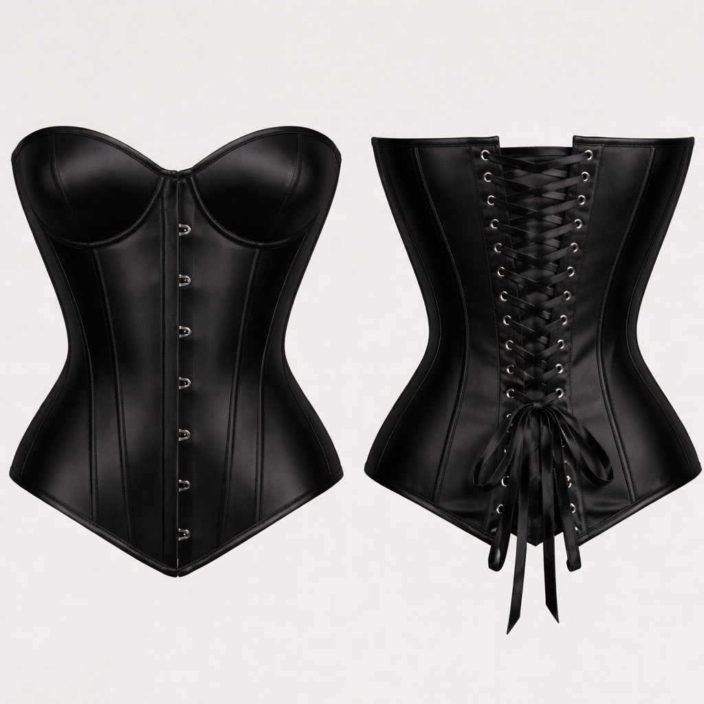 corset black satin elegant sexy schnürrung hinten vorne stützend gerader schnitt und bei den brüsten stützender shnitt unten gerade nicht spitzig bitte ab den seiten brustkorb runder ohne nahte im brust bereich und vorne zum einhängen satin elegant look