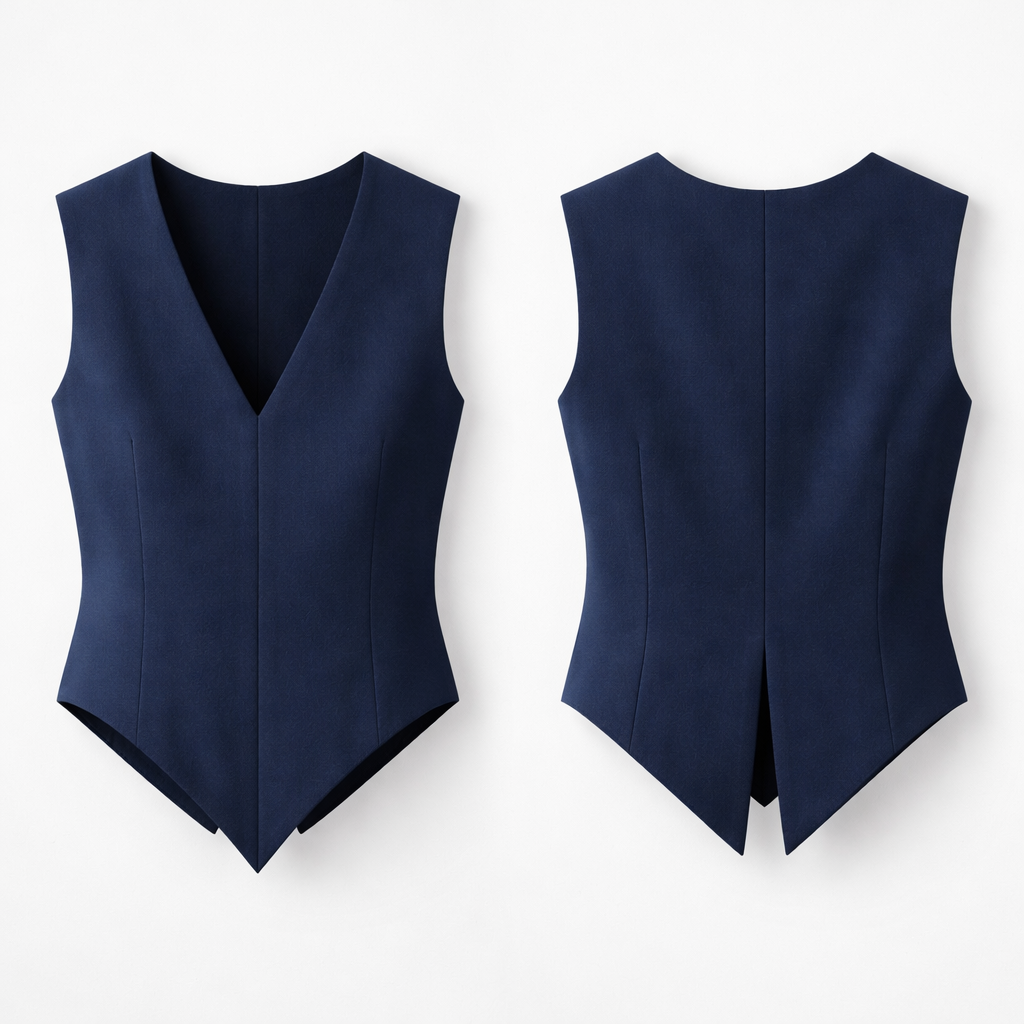 V neck blouse, navy color, rugged and v shape bottom, minimalist style, show front and back
