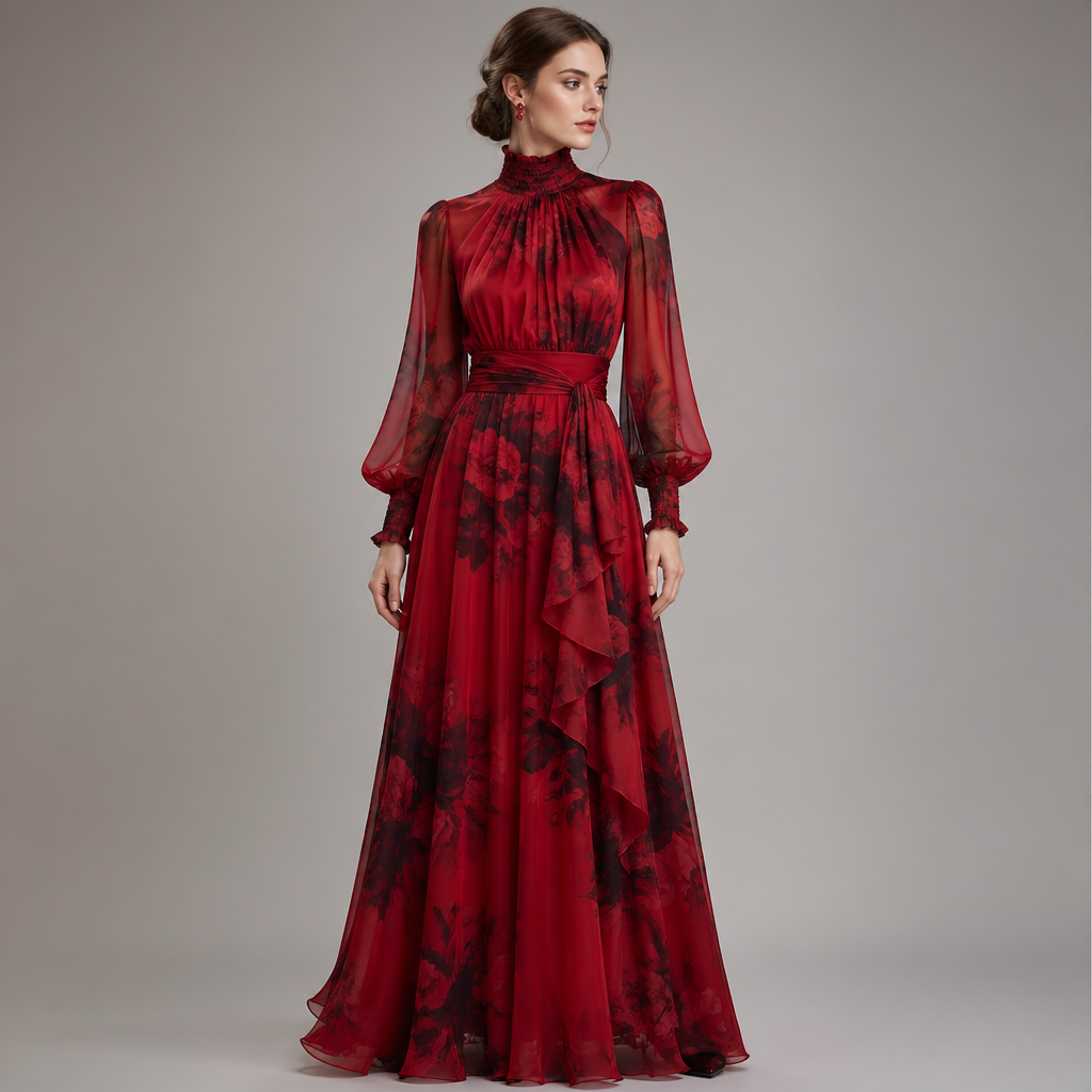 A Female Dress design, suitable for Spring, in Glamorous style. Silk, red with mix light black. HR fashion aesthetics. Design with modest coverage.