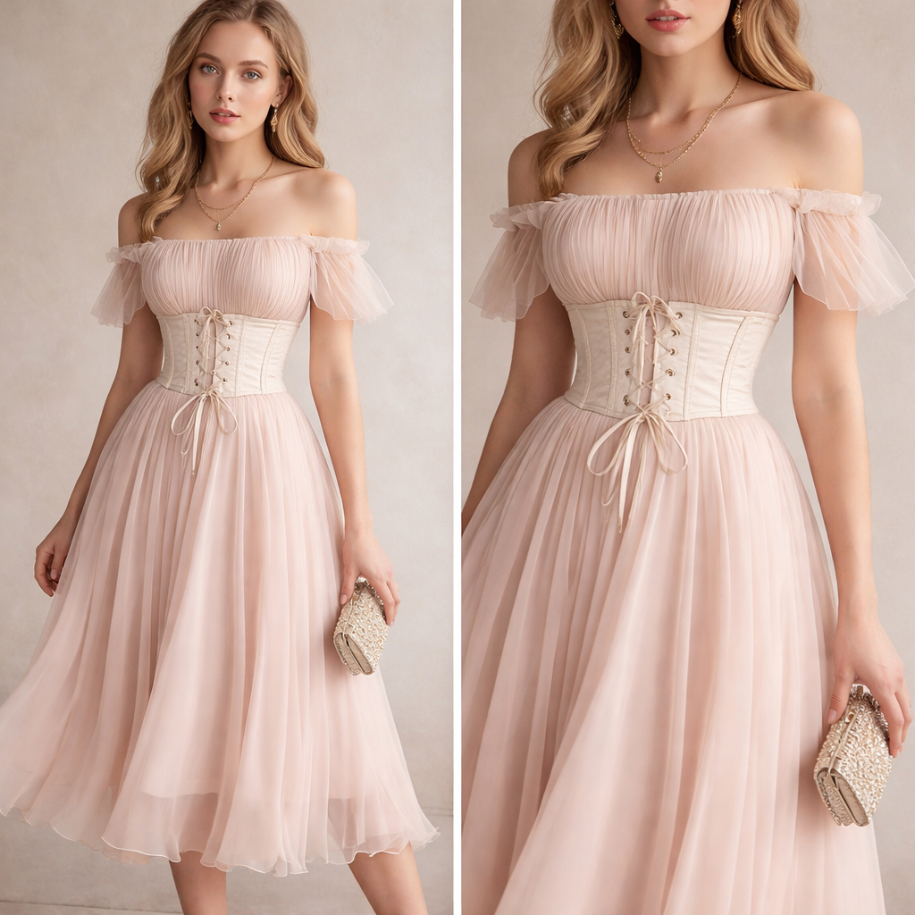 "Design a luxurious and feminine outfit, pastel colors, lace details, elegant silhouette"