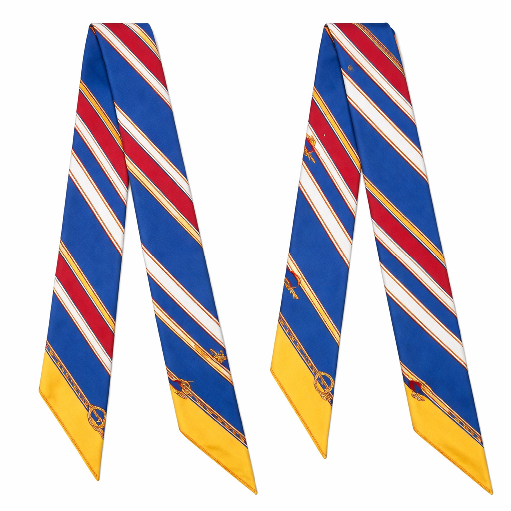 Design a scarf that is 5x86cm to be wrapped around the handle of a handbag for a lifestyle piece. Something Blair Waldorf would wear no bows no logos or words and simple Use these colors Royal Blue – #0057B8 • Crimson Red – #D50032 • Bright White – #FFFFFF • Gold / Yellow – #FFC72C • Sunflower Yellow – #FFD700, classic style, show front and back