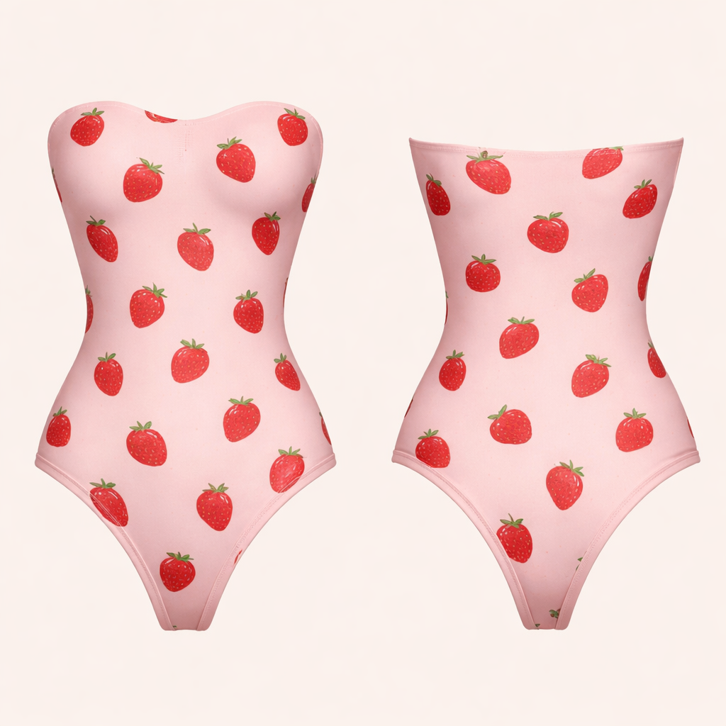 Bodysuit shape wear g string no ai model strapless no lines just no bow just string and no back open no ruffles strawberry