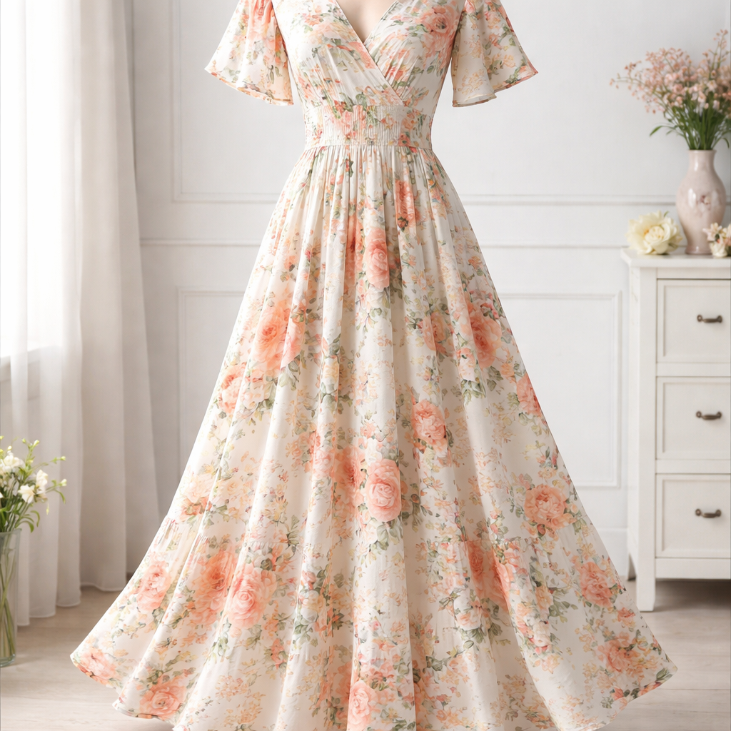 Design a simple maxi floral dress that is flair