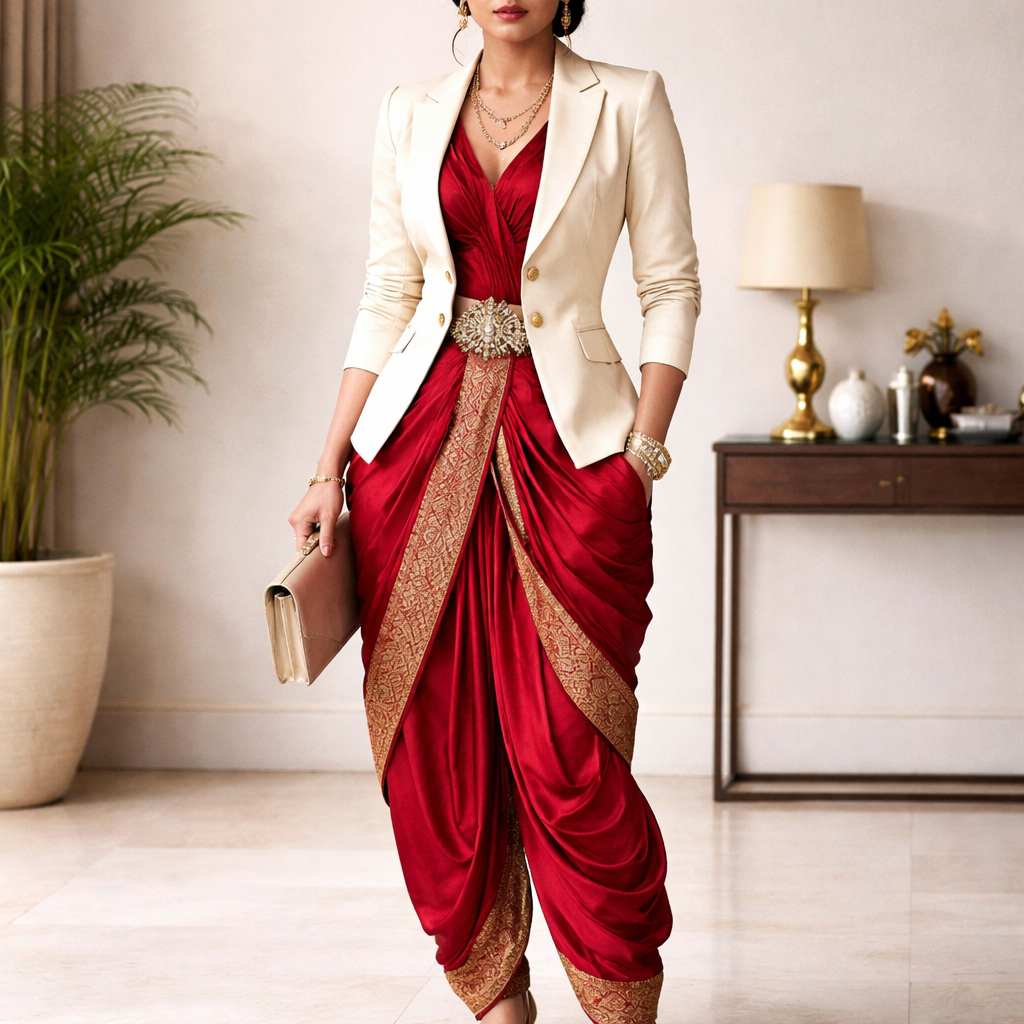 hindu dhoti for women with professional upper body match. Can be traditional in colors , business style
