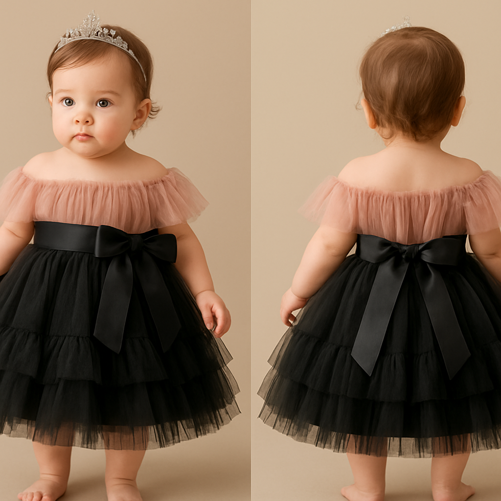 1歳の女の子のベビードレス着用画 黒のチュールドレス、膝丈のラッフルスカート(ボリューミー) 上半身は、細かいギャザーを寄せたチュールのボディスに、胸元から肩にかけてふんわりとかかるオフショルダー風のチュールを重ねたデザイン、アンティークピンク チュールは柔らかめで、肩に軽くかかるようにボリュームを持たせてください。 上のアンティークピンクの部分に黒のサテン生地の太めのリボンを一周巻いて、真ん中ではなく、左前あたりで大きくリボン縛り 頭には派手すぎないシルバーのティアラ, show front and back