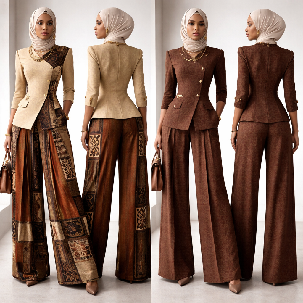 Crée un pantalon ample féminin avec un haut pour le travail, élégante et rare, style ample . Je veux une coupe parfaitement structurée avec pantalon ample gros bas, taille marquée , ou manches 3/4, et un col asymétrique chic. Le tissu doit être premium, sobre et luxueux, dans des tons africain bogolan . Ajoute des détails couture subtils : boutons dorés, plis élégants, poches discrètes et finitions impeccables. Le rendu doit être sophistiqué, professionnel et digne d’une directrice générale. Fais le model avec des tissus de couleurs pour la bas de la combinaison et un autre design pour le haut . Fais la combinaison moins plaqué fais la combo saison sans ceinture stp change le haut stp il est trop sexy fais moi un truc qu’une voilée peut porter pas trop de fantaisie encore un autre model avec chaîne devant sur le haut Faites un autre model encore fais avec tissus unique , show front and back