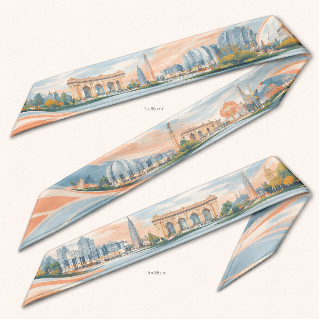 Design a silk scarf that is Kansas City lifestyle. No logos or words jus simple and elegant abstract and architectural lines it needs to be 5 x 86cm that wraps around the handle of a handbag, classic style, show front and back
