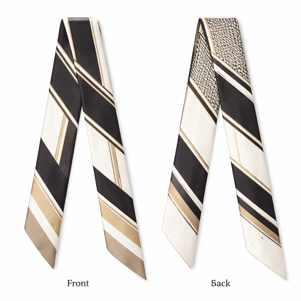 Design a scarf that is 5x86cm to be wrapped around the handle of a handbag for a lifestyle piece. Keep clean and simple. Something Audrey Hepburn would wear more geometric add a tailored touch no chain detail, classic style, show front and back