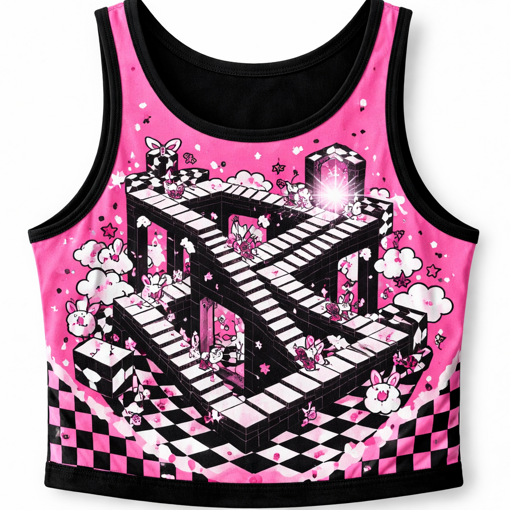 Korean Fashion fashion design: Kawaii M.C. Escher-inspired tank top in bright pink, black, and white. Features a loose fit and a cropped hem, embodying playful Korean street style.