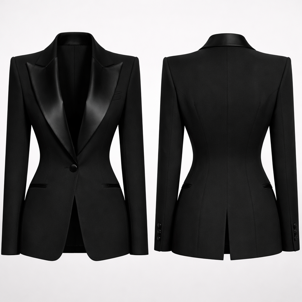 schwarzer blazer figurbetont mit satin flügel ohne taschen nur die naht der tasche und schwarzen satin knopf weniger figurbetont einbisschen wie tomford, elegant style, show front and back